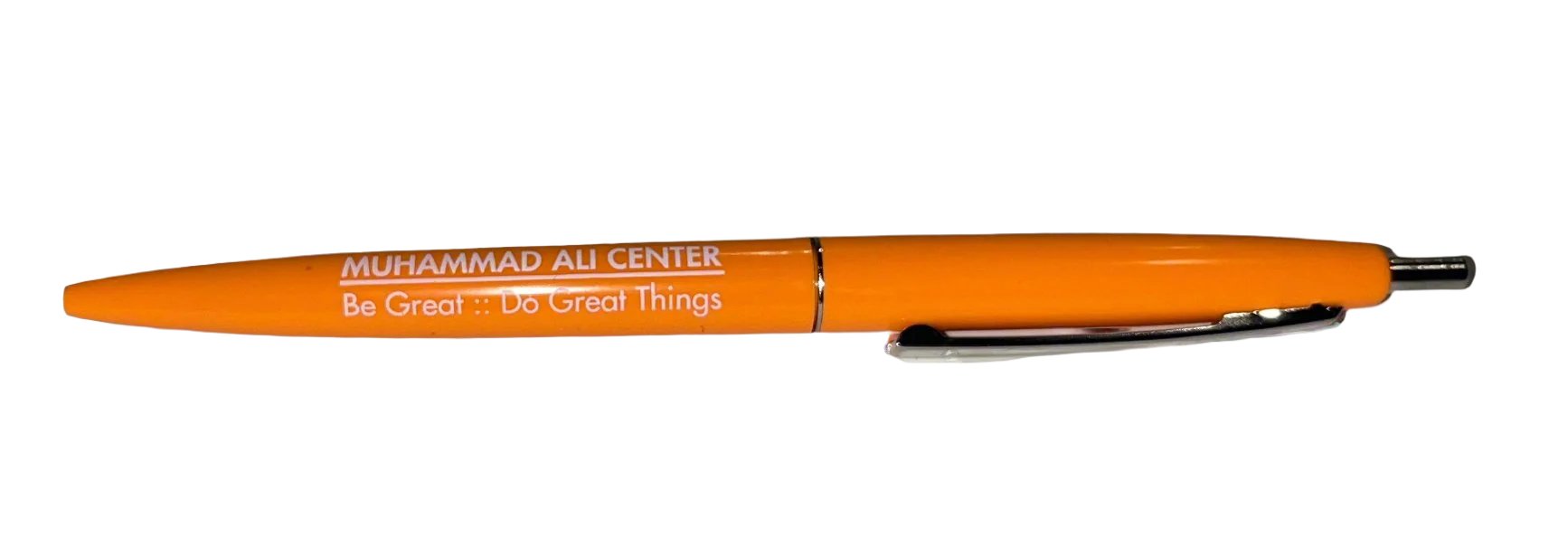 An orange pen (manufactured by Clic) featuring the words "Muhammad Ali Center, Louisville, KY"