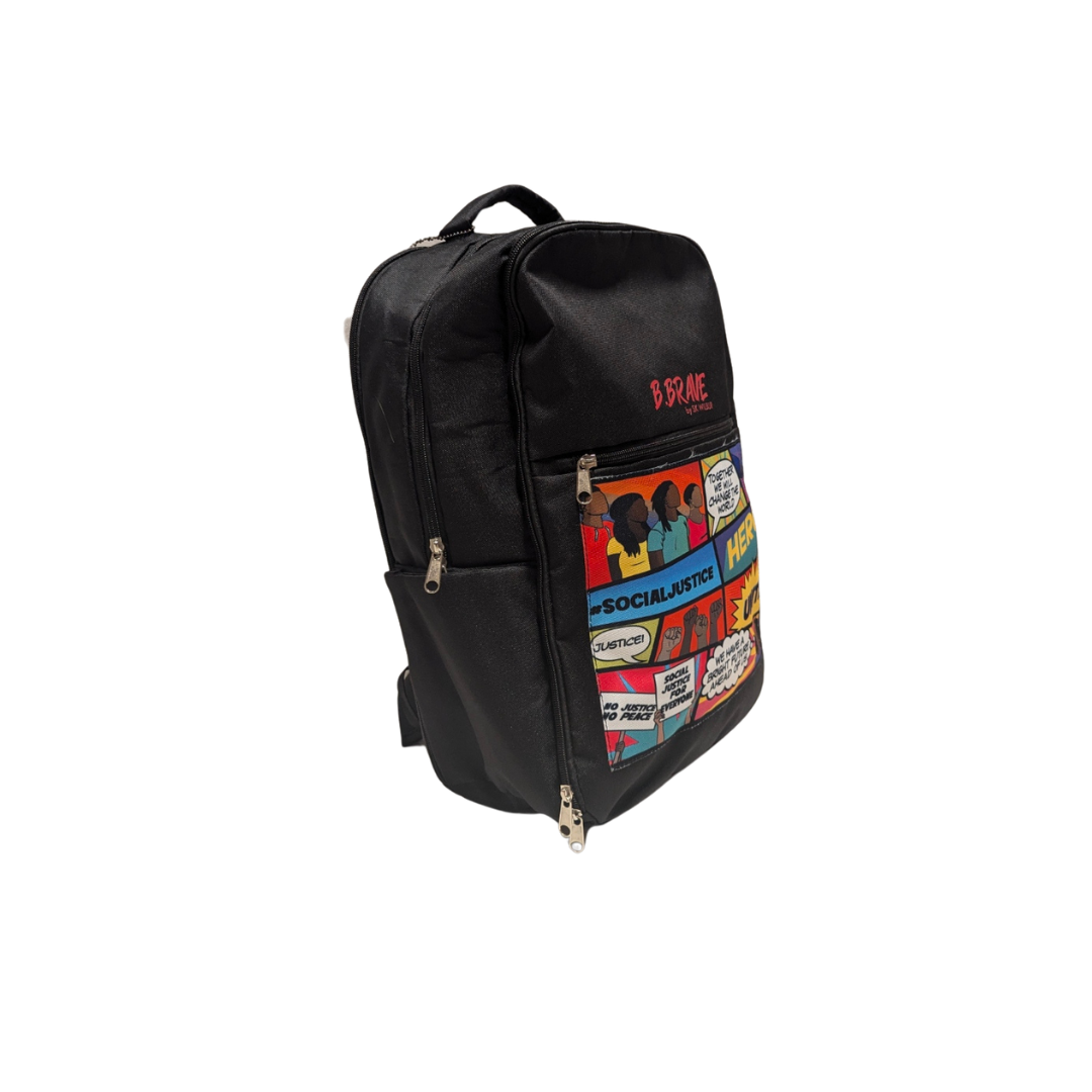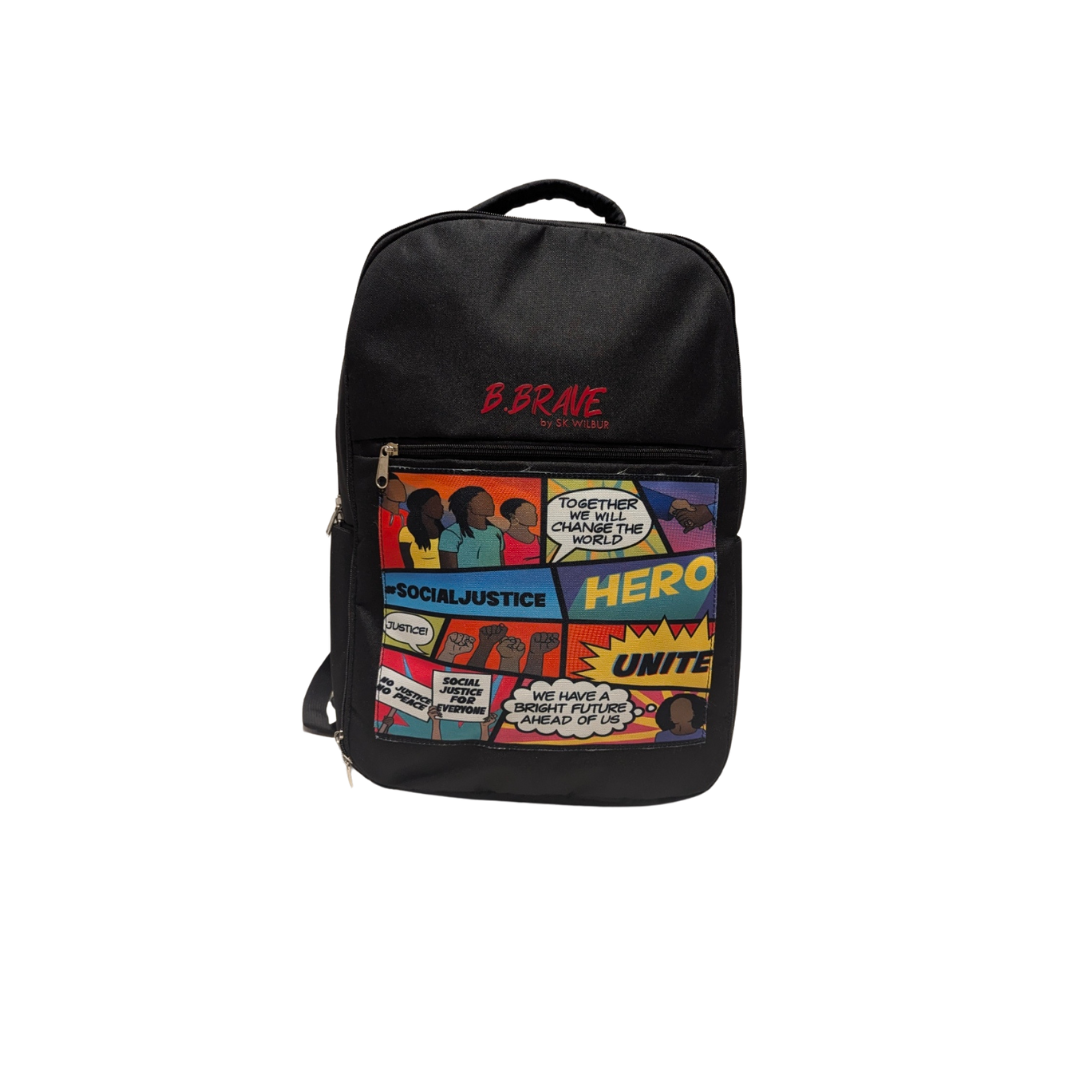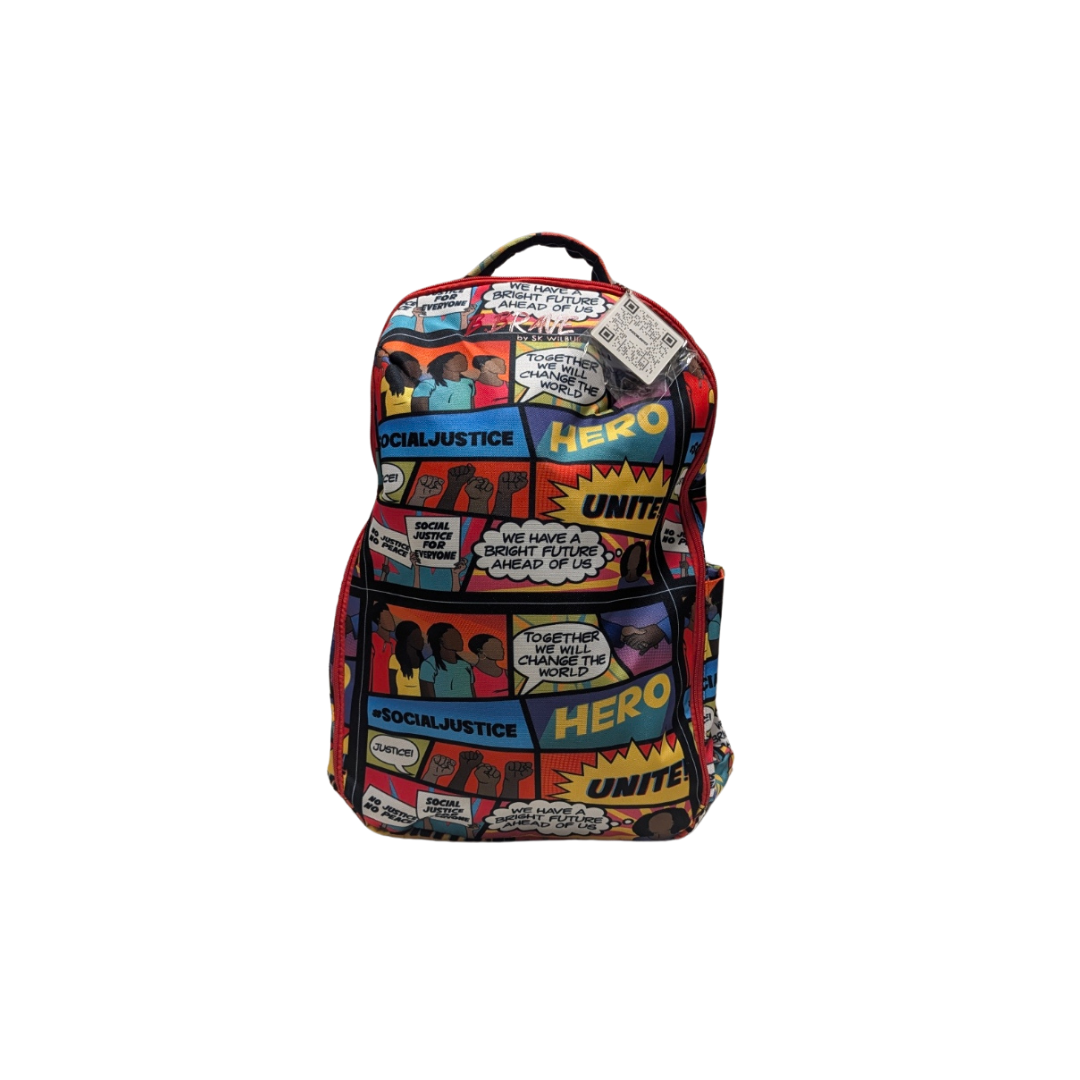 Social Justice is the fair treatment of all people in a society, including respect for the rights of minorities and equitable distribution of resources among members of a community. Bright colors and inspiring words like HERO and UNITE on this backpack bring attention to the importance of social justice. It's roomy, holding your school supplies and laptop, and comes in four different colorways - Black, Navy, Gray, and the all over comic book "cloak" print (labeled as multicolor). It also includes the QR Code hang tag that, when scanned, takes you to the B. Brave website to shop and learn about social justice superheroes.
