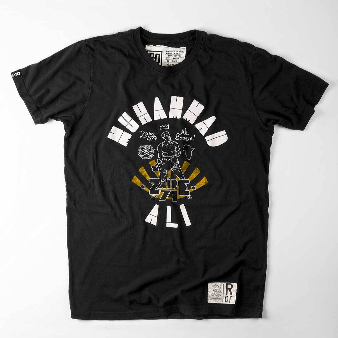 This charcoal colored 100% cotton t-shirt features a design celebrating Muhammad Ali's 1974 win against George Foreman. During this fight in Zaire, fans chanted, "Ali, Bomaye!"